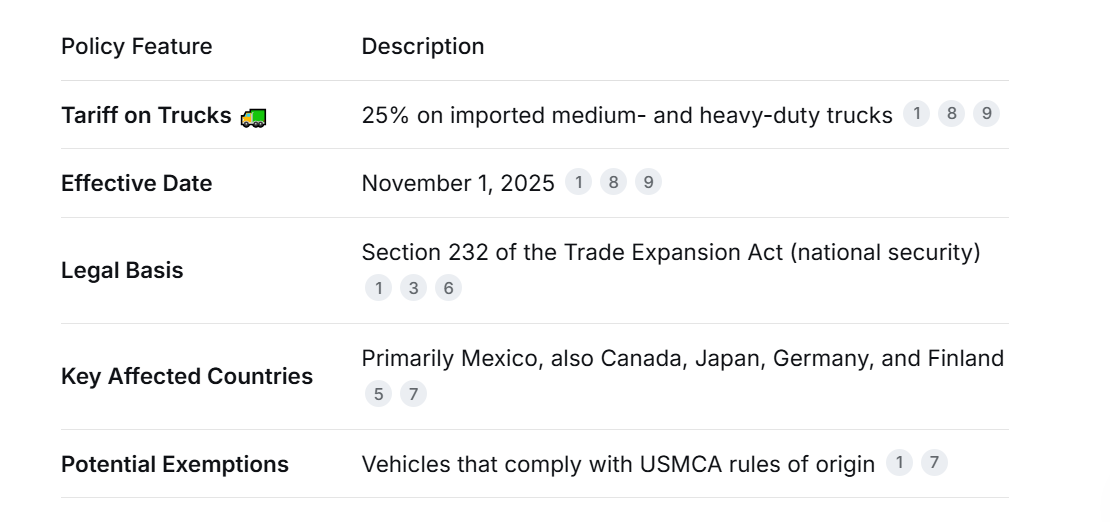 1. Beleidsgrondslag: Dit tarief is gebaseerd op een Sectie 232-onderzoek dat in april 2025 werd gestart en waarin werd geconcludeerd dat de afhankelijkheid van geïmporteerde vrachtwagens een bedreiging vormt voor de Amerikaanse nationale veiligheid en de binnenlandse logistieke keten. Het doel is om Amerikaanse fabrikanten en banen te beschermen.